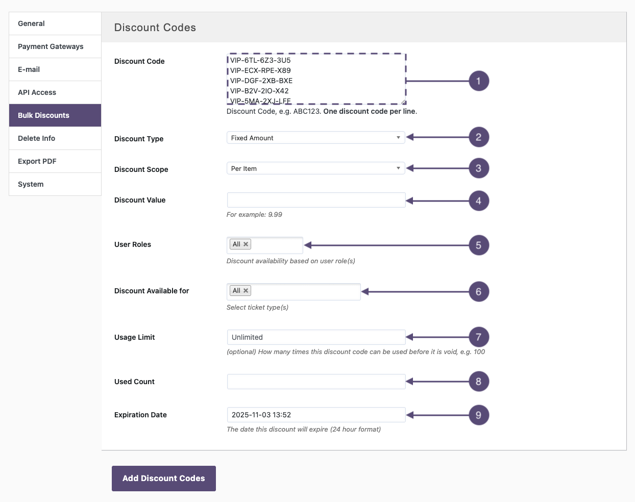 The Bulk Discount Codes add-on allows you to create multiple discount codes at once instead of adding them manually one by one. This is perfect when you need to generate unique codes for sponsors, partners, VIP guests, students, corporate discounts, influencer campaigns, and similar use cases.