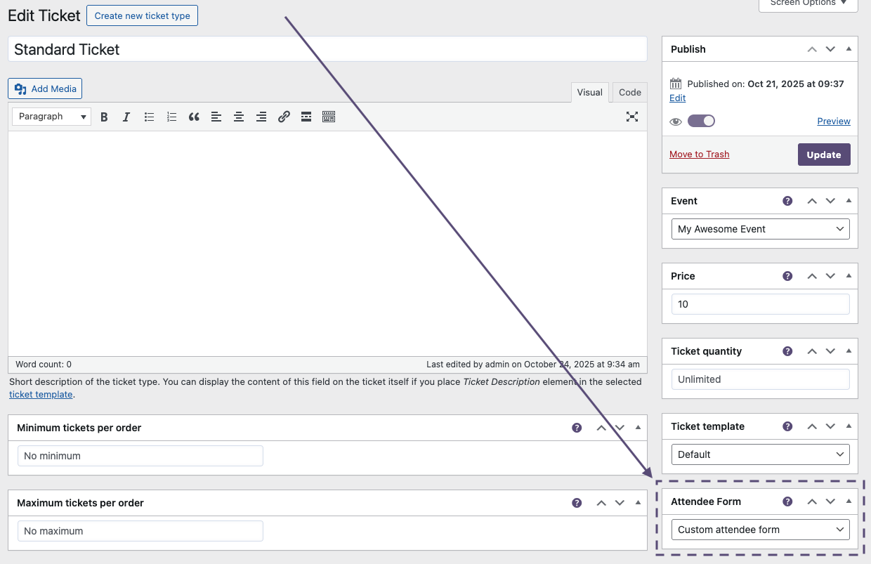 Once your forms are ready, you can assign them to specific ticket types when creating or editing tickets. This determines where the form appears and who fills it out.