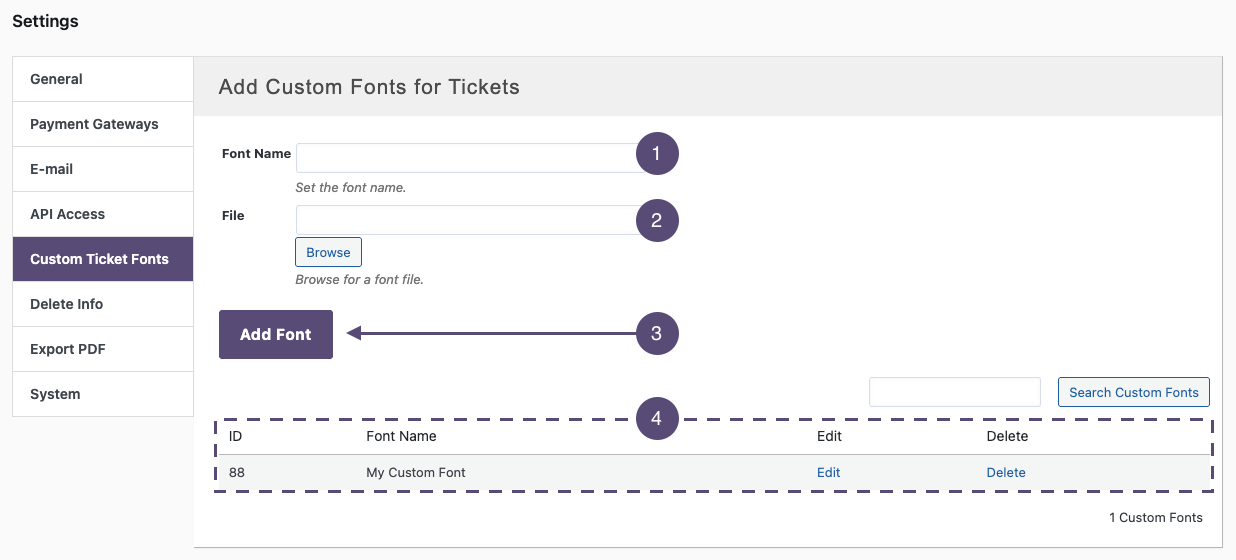- Font Name - Enter a name for the font you’re adding. This is how it will appear later in the ticket template font dropdown.