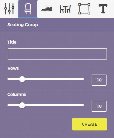 Open the Seating group pane by clicking the chair icon in the toolbox, then click anywhere on the seating canvas where you want your group to appear. The panel on the right will show a few basic options.