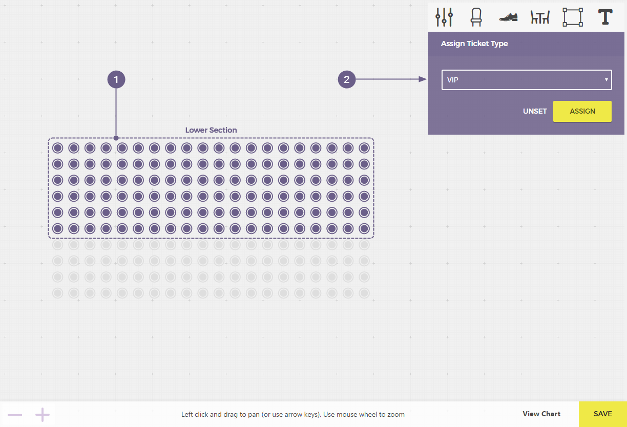 Click and hold your mouse to select one or more seats you want to assign to a specific ticket type.