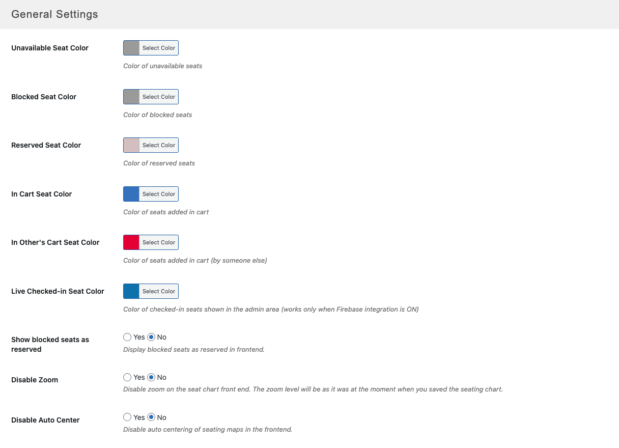 Below the color settings, you’ll find options that control the functionality and appearance of seating charts on the front end.