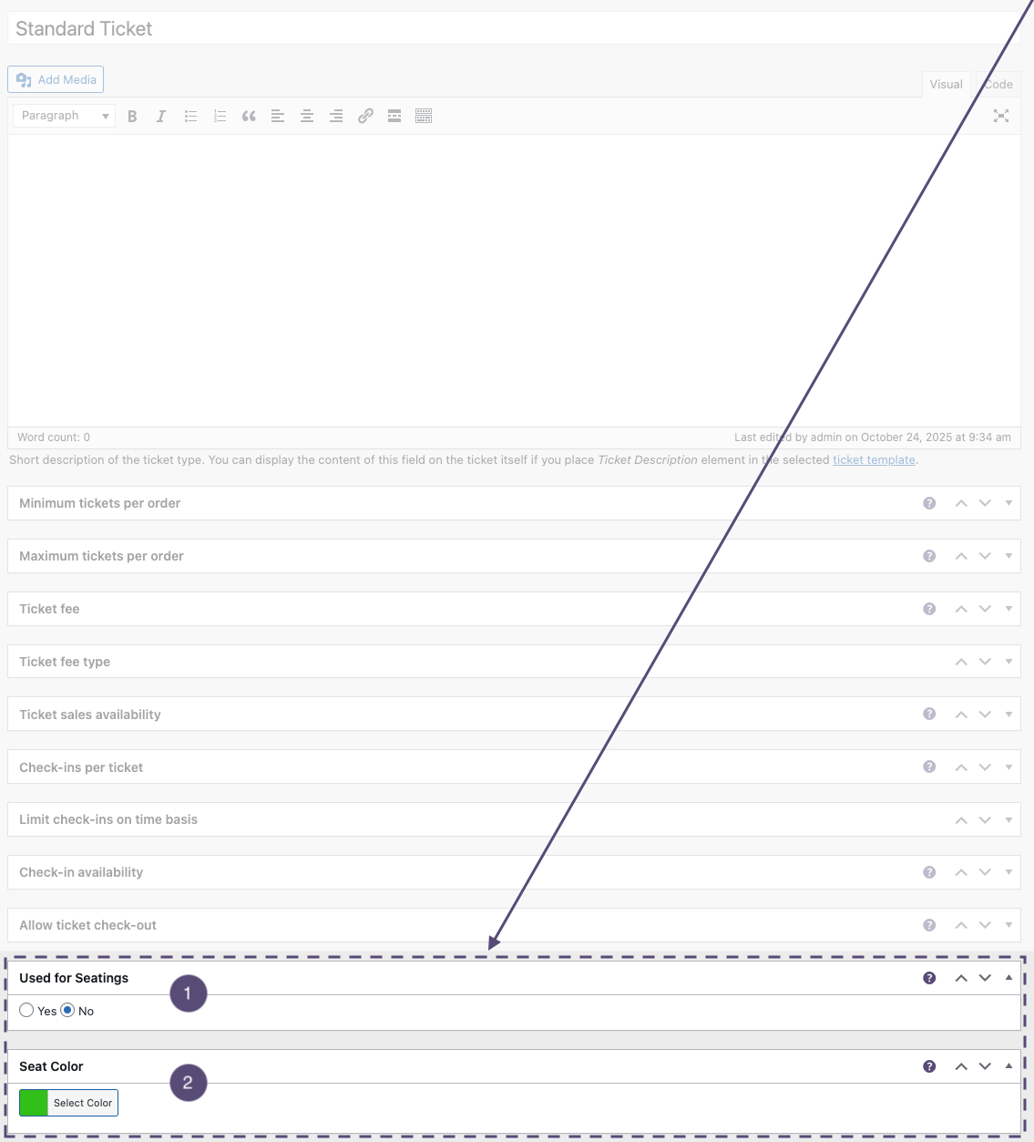 To make this connection possible, the Seating Charts add-on adds two additional options to every ticket type. Both options are available whether Tickera is used as a standalone plugin or alongside WooCommerce via Bridge for WooCommerce.