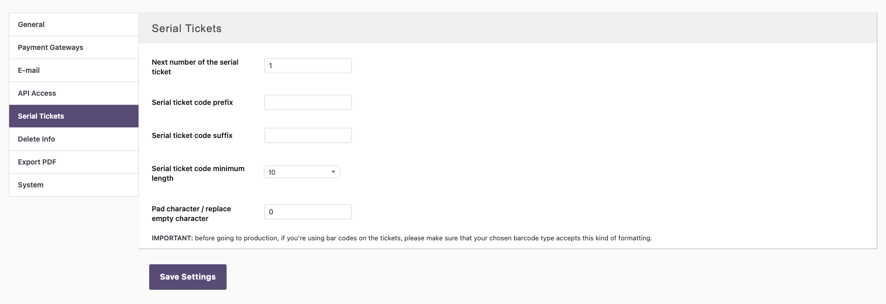 - Serial ticket code minimum length - defines the minimum number of characters in your ticked code.