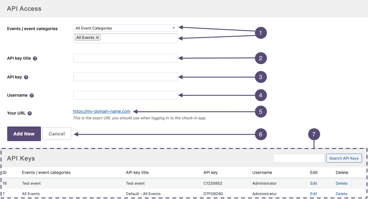 Once created, your API keys will appear in the table below, along with any that were automatically generated when you added new events.The table lists: