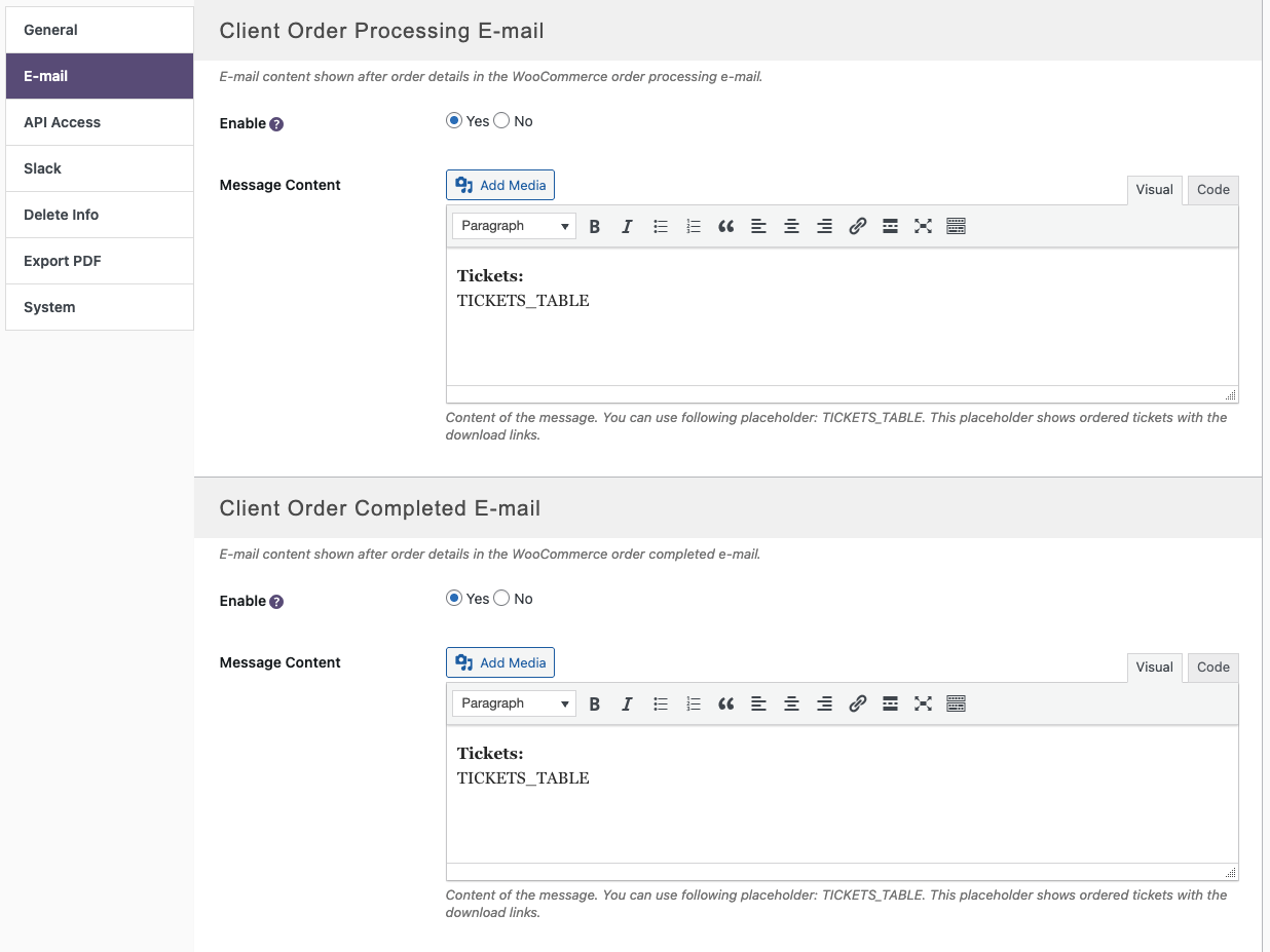 You can add any custom text in Tickera’s Email Settings, and Tickera will append that text to the buyer email WooCommerce sends. Within that appended content, Tickera supports TICKETS_TABLE placeholder. This placeholder generates a table listing all tickets purchased in the WooCommerce order.